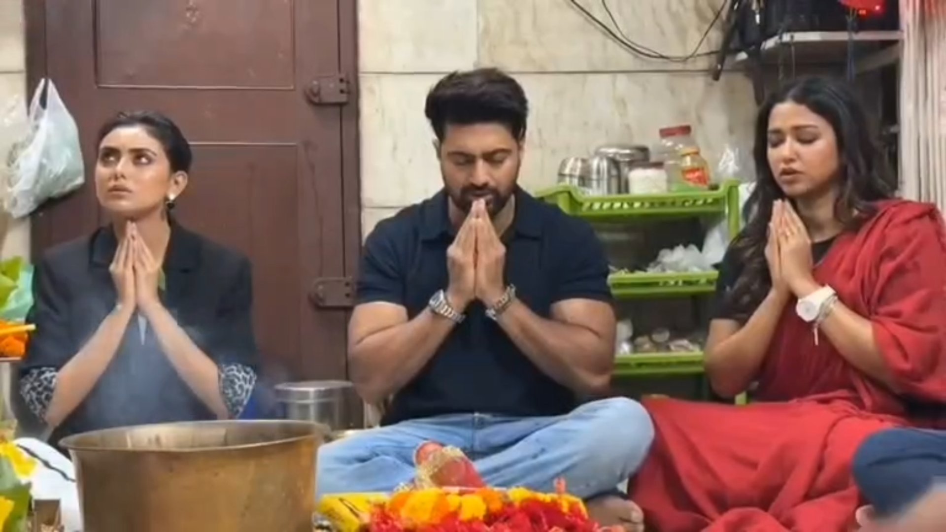 সকালে মন্দিরে গিয়ে দেবীকে পুজো দেন দেব। ফুল হাতে মায়ের চরণে প্রার্থনা করে তিনি নেন আশীর্বাদ, কপালে সিঁদুরের তিলক পরেন। মন্দিরের পুরোহিত তাঁকে উত্তরীয় পরিয়ে দেন। এদিন দেবের পরনে ছিল কালো পোশাক, সোহিনীর লাল শাড়ি ও কালো ব্লাউজ, আর ইধিকা বসেছিলেন দেবের একেবারে পাশে। পুজো শেষে দেব নিজেই জানান, “এই ছবির সাফল্যের জন্যই আজ মায়ের কাছে প্রার্থনা করেছি।”
