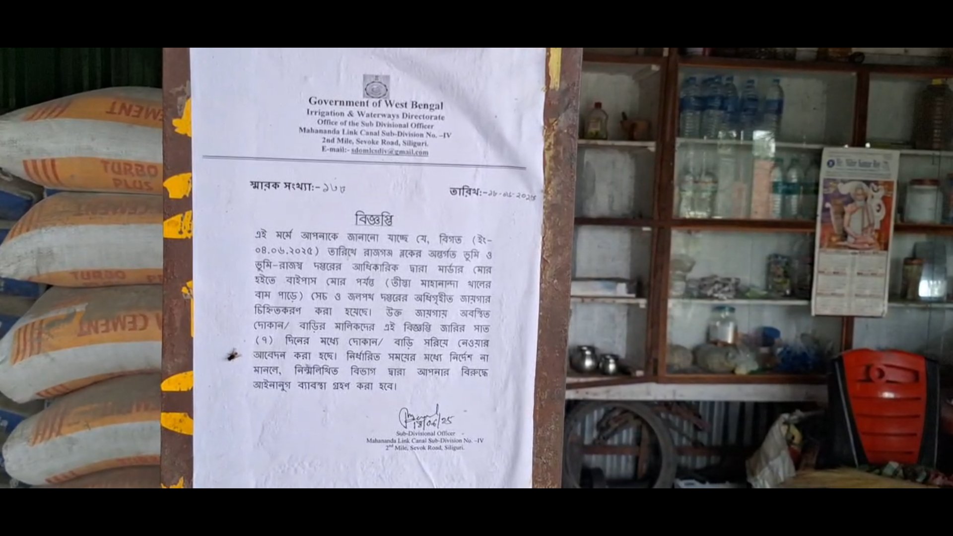 ফুলবাড়ি, ২৪ জুন: সরকারি জমিতে বছরের পর বছর ধরে গড়ে ওঠা দোকানপাট ও ঘরবাড়ির উপরে এবার প্রশাসনিক খাঁড়া। রাজগঞ্জ ব্লকের ফুলবাড়ি মার্ডার মোড় থেকে বাইপাস মোড় পর্যন্ত তিস্তা ক্যানেলের বাম পাড়ে থাকা সমস্ত অবৈধ নির্মাণ সরিয়ে নিতে সাত দিনের সময়সীমা বেঁধে দিল সেচ দপ্তর। ইতিমধ্যেই দেওয়া হয়েছে লিখিত নোটিশ।
