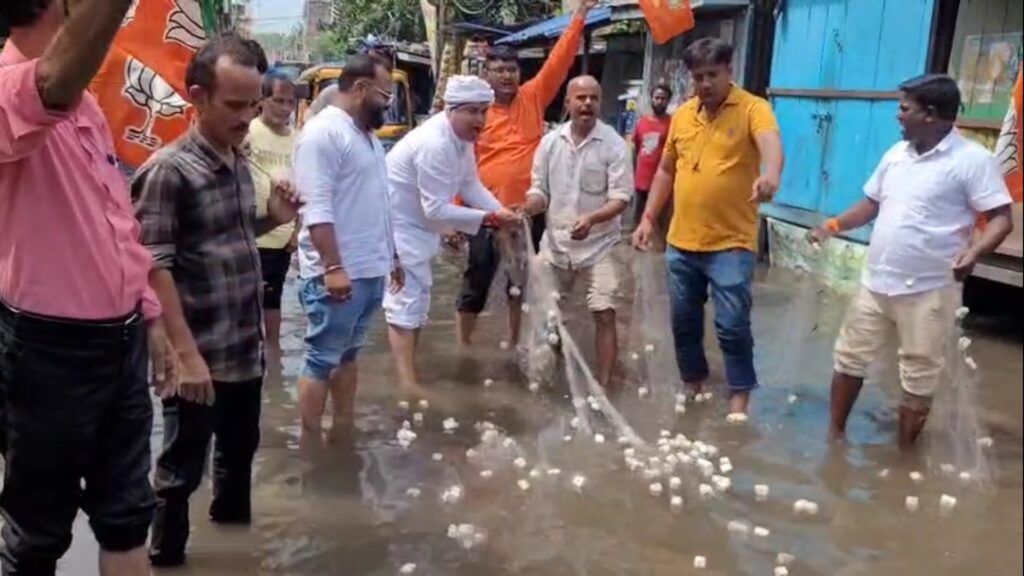 বিশ্বজিৎ নাথ : টানা পাঁচ ঘণ্টার বৃষ্টিতে ব্যারাকপুর ও টিটাগড় কার্যত জলমগ্ন। রাস্তাঘাট থেকে বাজার— সর্বত্র হাঁটু পর্যন্ত জল জমে জনজীবন বিপর্যস্ত। ঠিক সেই সময় মঙ্গলবার টিটাগড় পুরসভার পাশে এপি দেবী রোডে অভিনব প্রতীকী প্রতিবাদে নামল বিজেপি। জাল ফেলা থেকে শুরু করে নৌকা চালানো- সবকিছুর মধ্যেই উঠে এল সাধারণ মানুষের দুর্ভোগের চিত্র।
