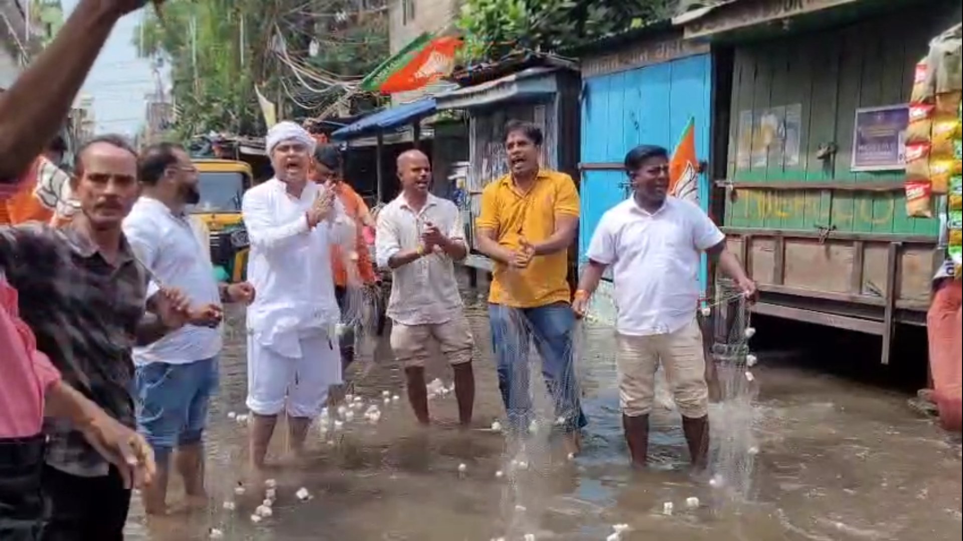 জলবন্দি টিটাগড়বাসীর ক্ষোভের মাঝেই এই অভিনব প্রতিবাদ ফের রাজনৈতিক তরজা উসকে দিল।